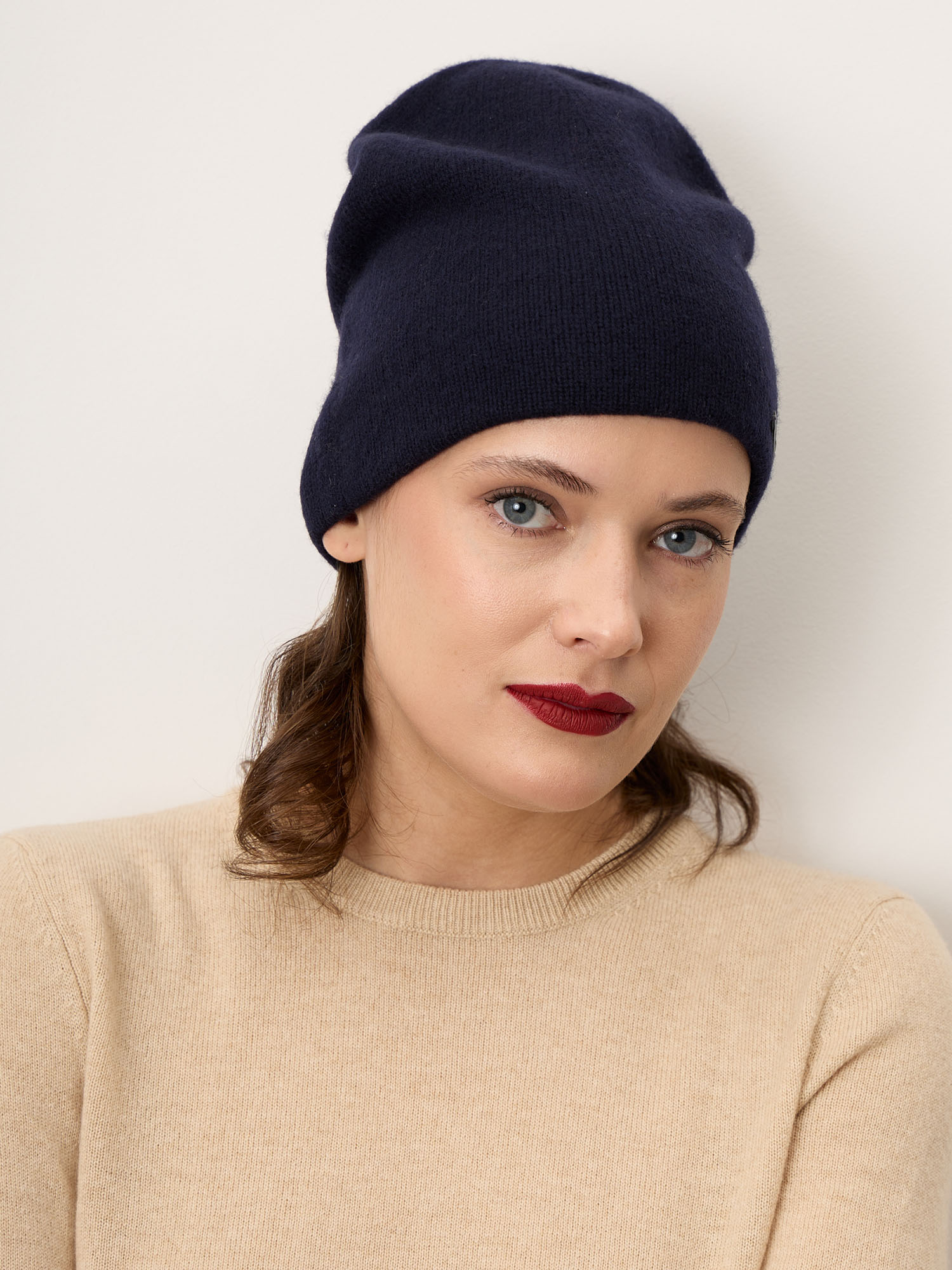 Лаконичная модель в формате классической шапки-бини с мягкой удлинённой формой. Аккуратно облегает голову, создавая элегантный силуэт без излишнего объёма. Двойная вязка обеспечивает дополнительное тепло и аккуратную посадку. Минималистичная фирменная нашивка подчеркивает премиальный характер изделия.