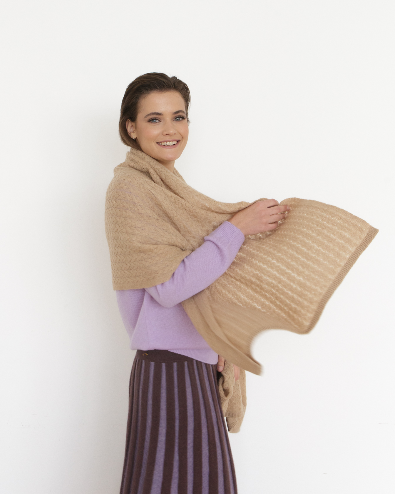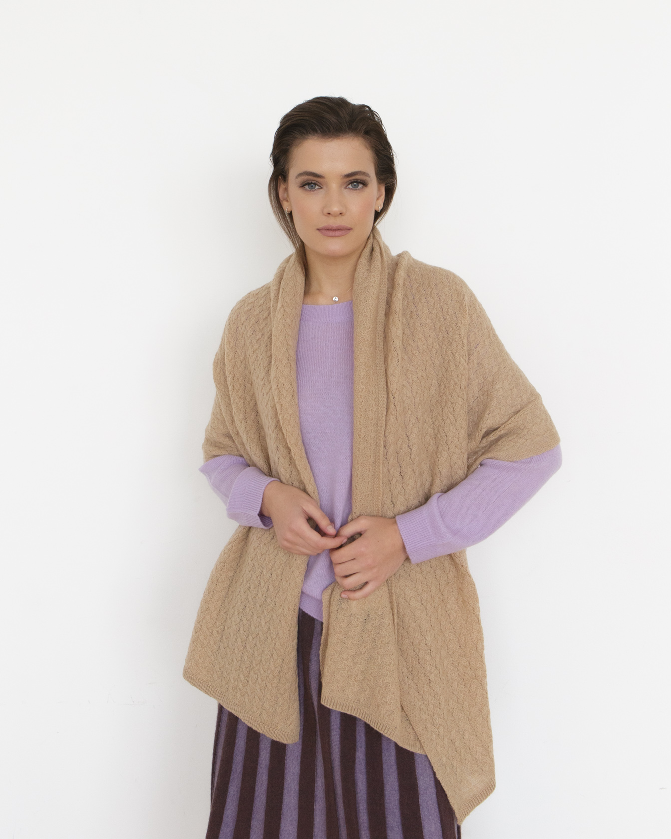 Мягкий, легкий и приятный к коже палантин хорошо драпируется и позволяет создавать различные способы ношения — на плечах, вокруг шеи или в виде уютной накидки.