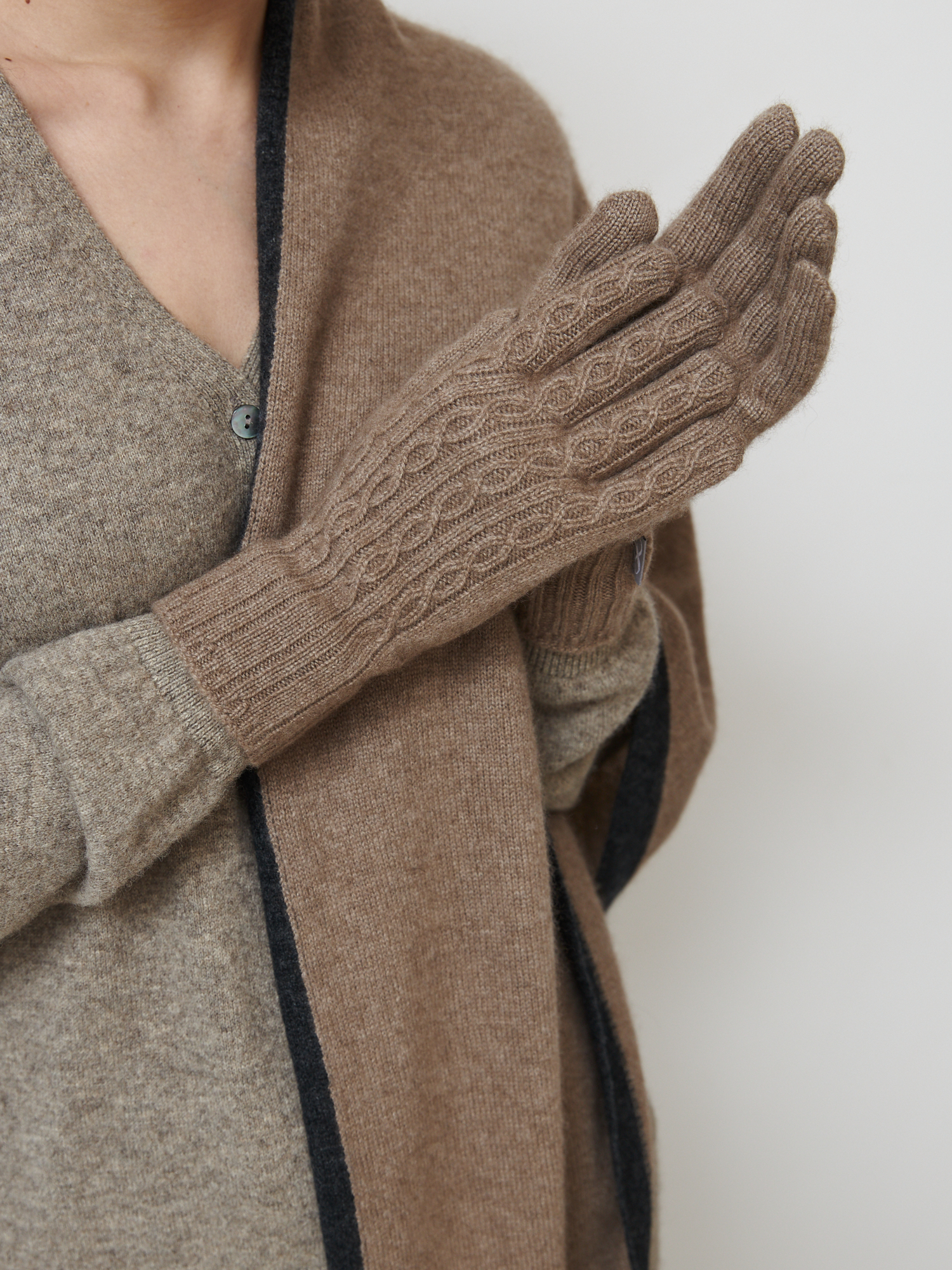 Перчатки выполнены из натурального кашемира — премиального материала с исключительной мягкостью и лёгкостью. Тонкое волокно эффективно удерживает тепло, оставаясь «дышащим» и гипоаллергенным. Кашемир обеспечивает высокий уровень комфорта и долговечности, оправдывая свою ценность