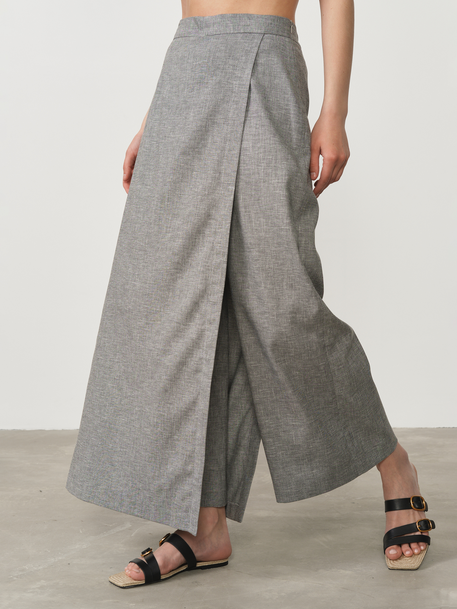Элегантная юбка-брюки из 100% натурального льна в глубоком темно-сером оттенке – стильное решение для современной женщины, ценящей комфорт без компромиссов с элегантностью. Этот универсальный предмет гардероба сочетает в себе практичность классических брюк и женственность юбки, создавая оригинальный и функциональный силуэт. Натуральный лен, известный своими исключительными свойствами, обеспечивает превосходную воздухопроницаемость и естественное охлаждение, что делает эту модель идеальной для теплого сезона.