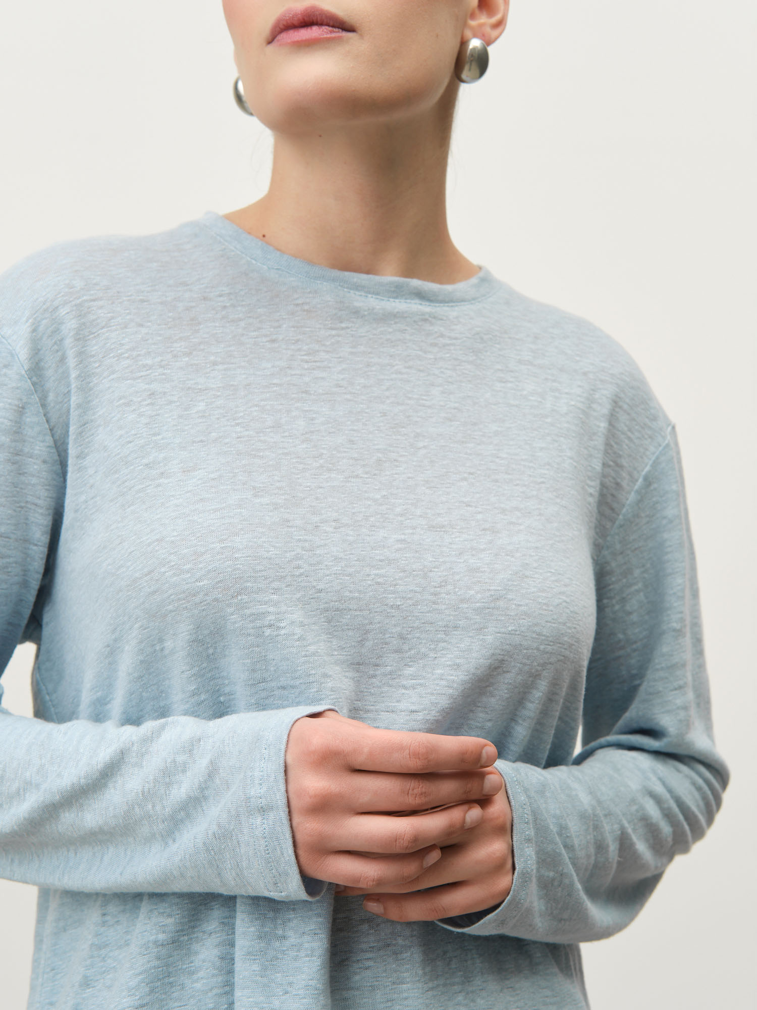 Голубой лонгслив из льна – легкость и комфорт в каждой детали. Натуральный материал дарит воздухопроницаемость и приятные тактильные ощущения, а свободный крой обеспечивает удобную посадку. Нежный оттенок добавляет образу свежести и универсальности.