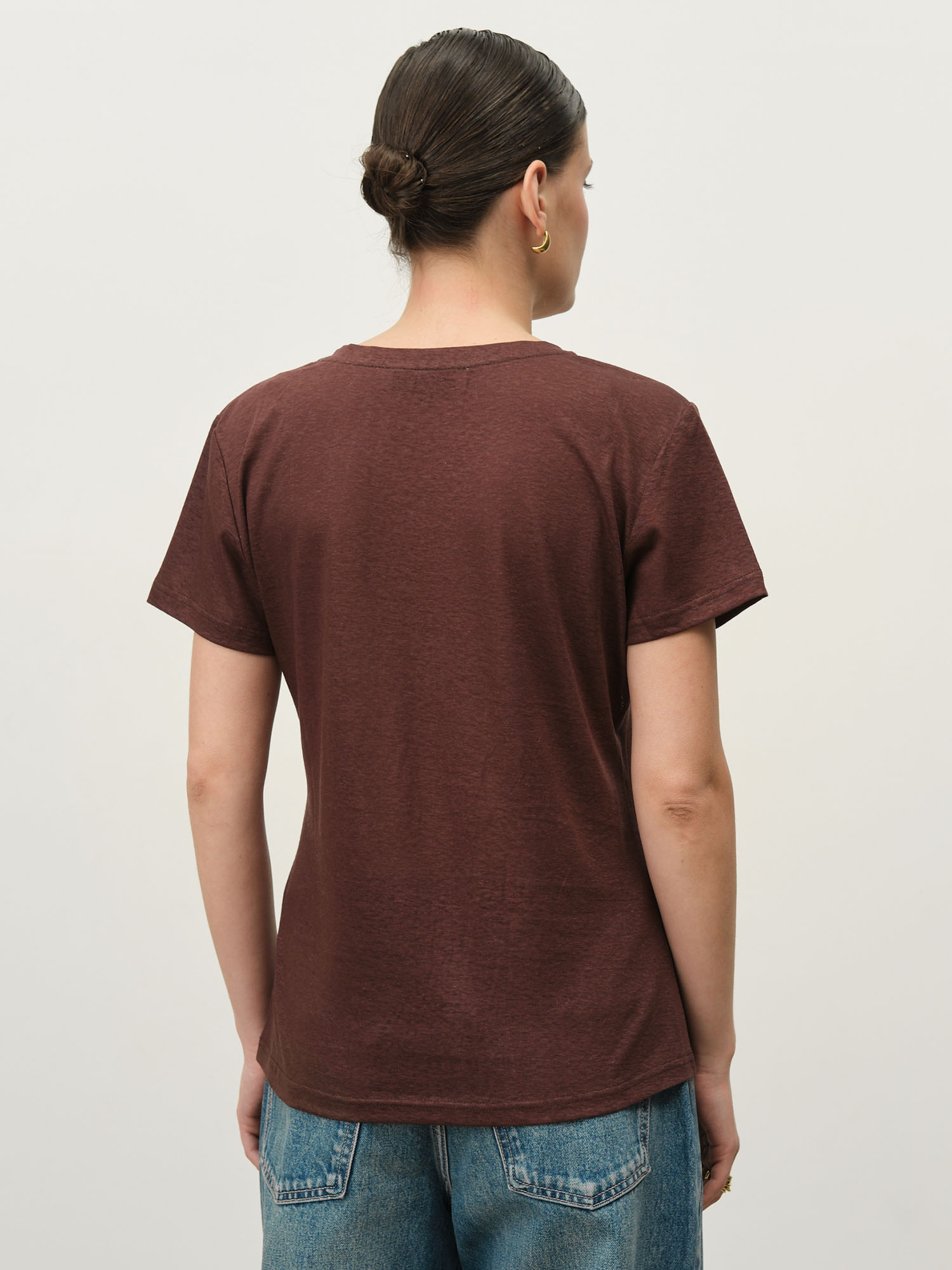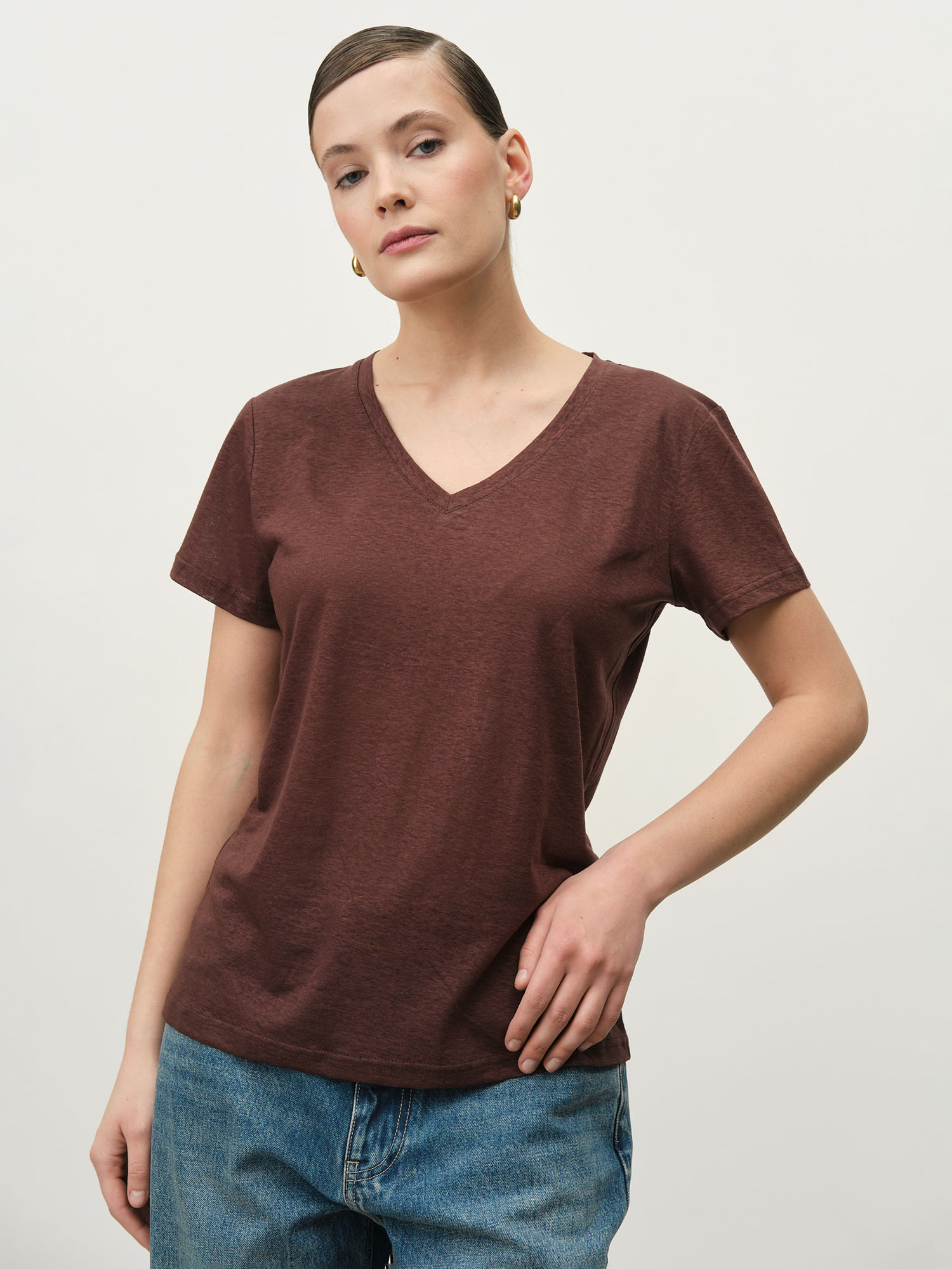 Футболка из крапивы в насыщенном шоколадном оттенке — стильное и экологичное решение. Натуральный материал дарит комфорт и хорошую воздухопроницаемость. V-образный вырез подчеркивает линию шеи и добавляет элегантности. Идеальна для повседневного гардероба.