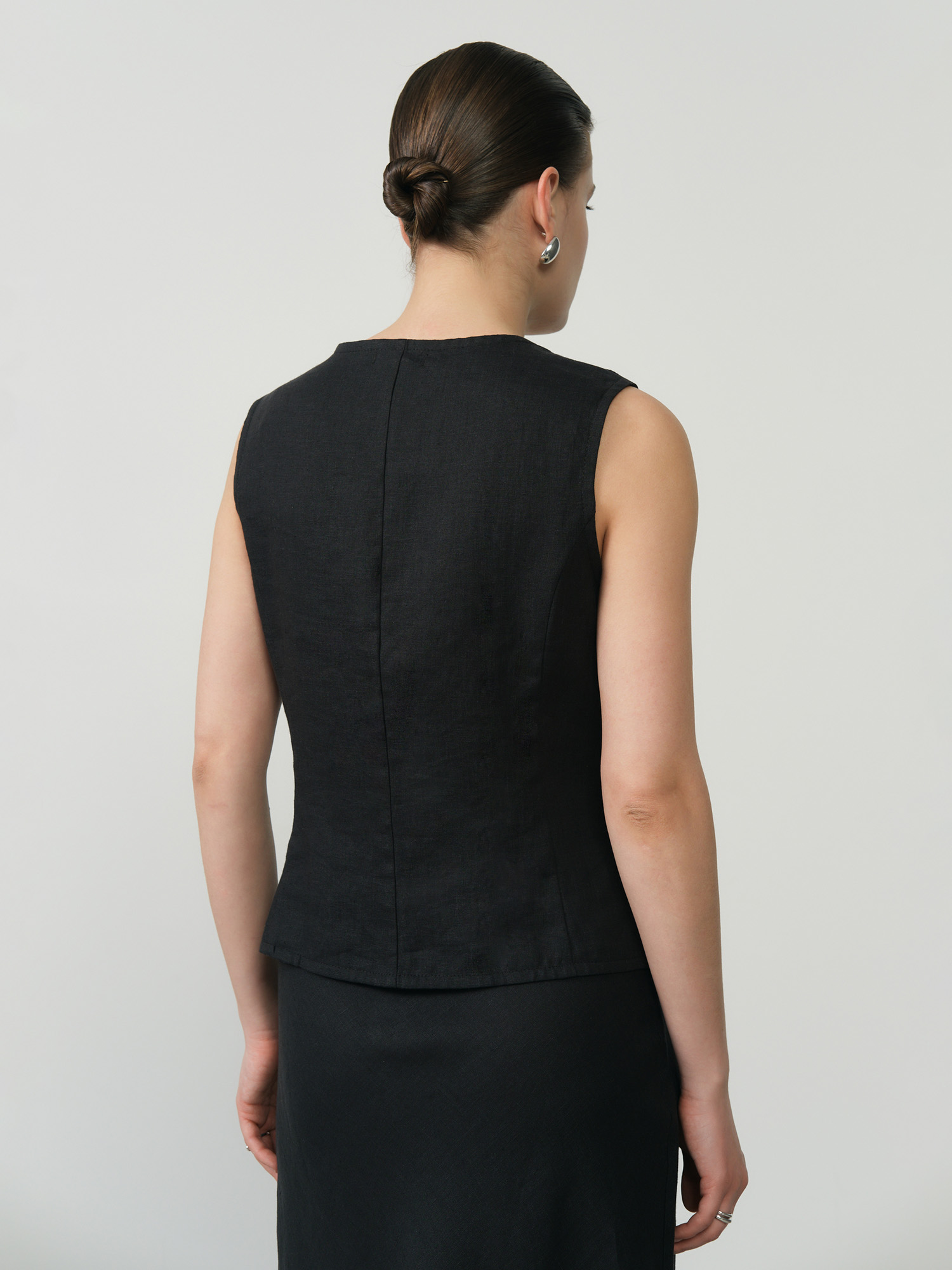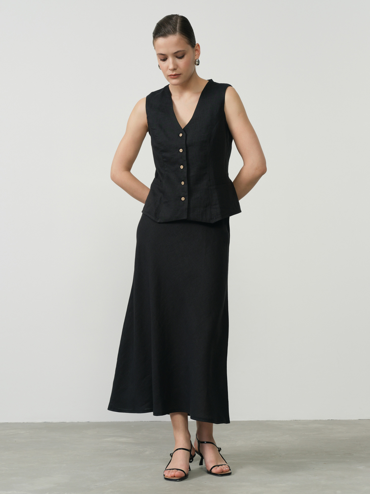 Натуральная ткань для жаркой погоды обеспечивает оптимальный микроклимат, льняное полотно прекрасно впитывает влагу и быстро сохнет. Жилет функционально универсален – он гармонично дополнит образ с брюками, юбками различной длины, платьями и джинсами, добавляя ему структурности и завершенности.