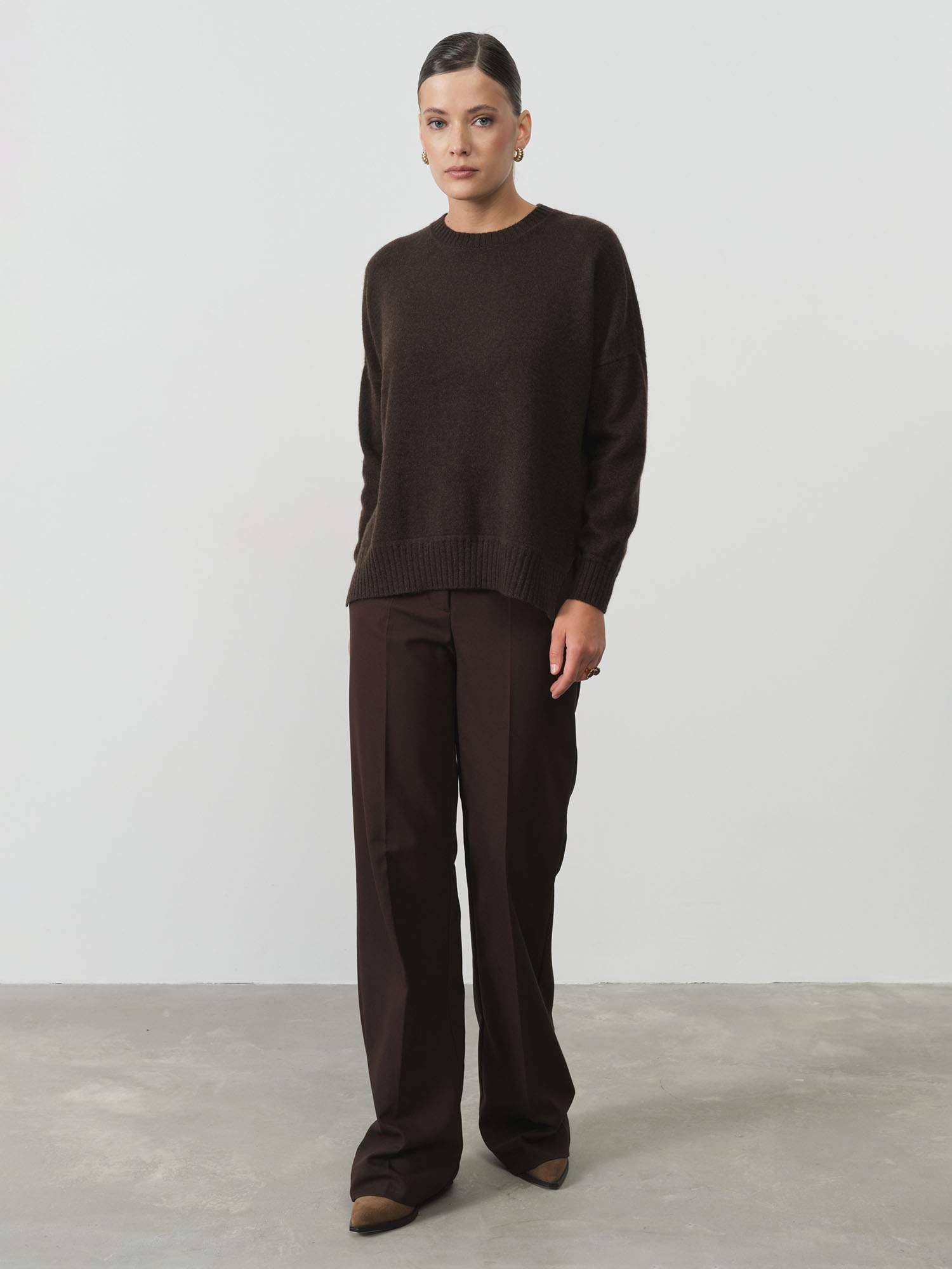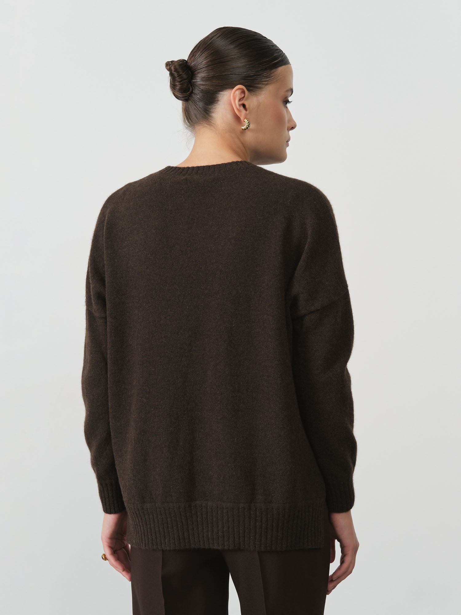 Модель выполнена в классическом прямом силуэте с круглой горловиной и гладкой вязкой. Минималистичный стиль подчёркивает благородную текстуру материала и делает изделие универсальным для разных образов.