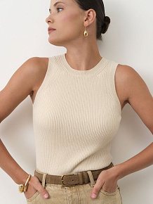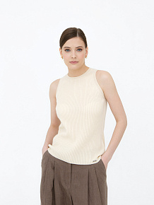 Минималистичный дизайн без рукавов с аккуратной круглой горловиной. Эластичная вязка по краю горловины и по низу изделия сохраняет форму и подчёркивает аккуратность силуэта.