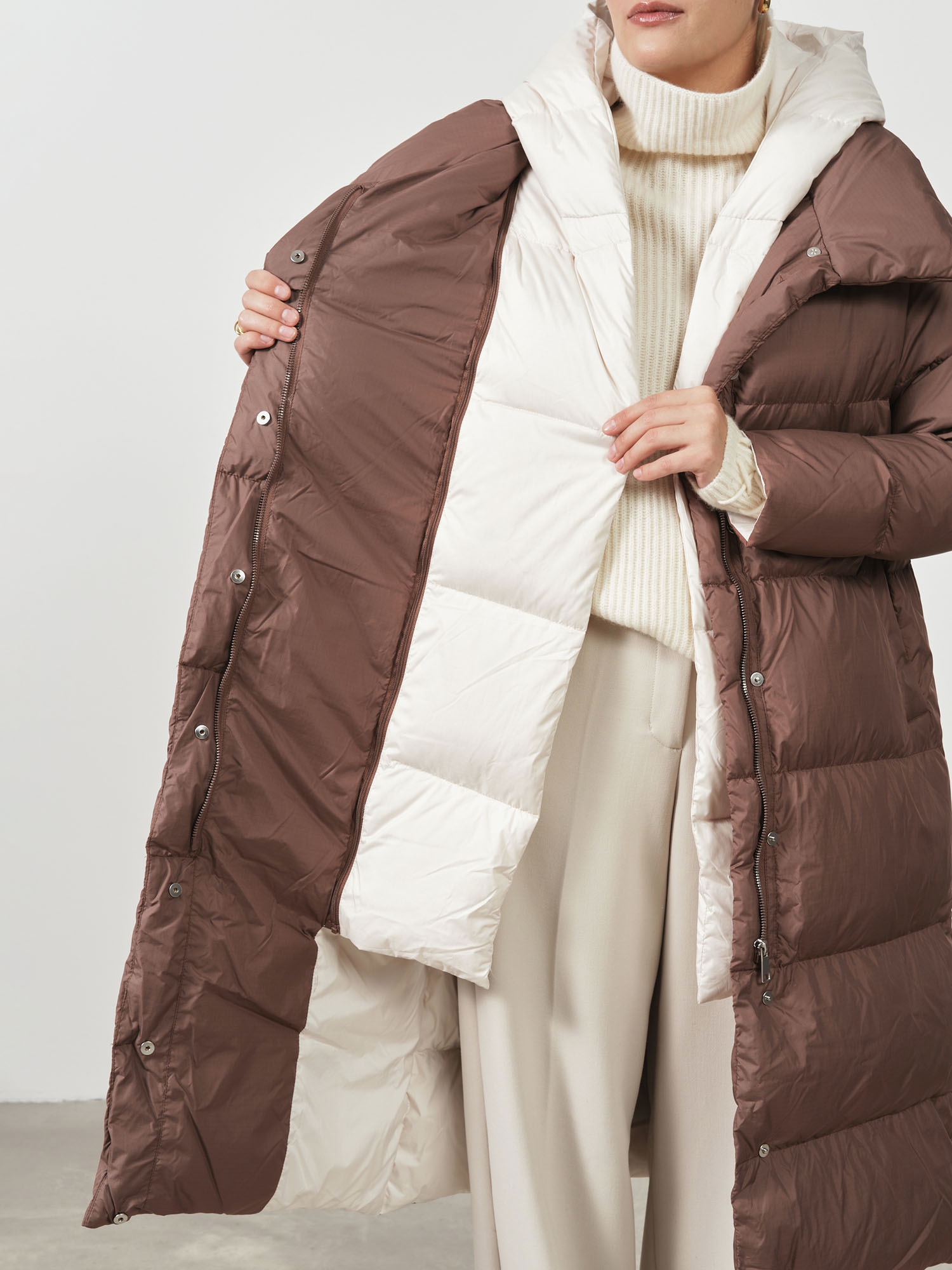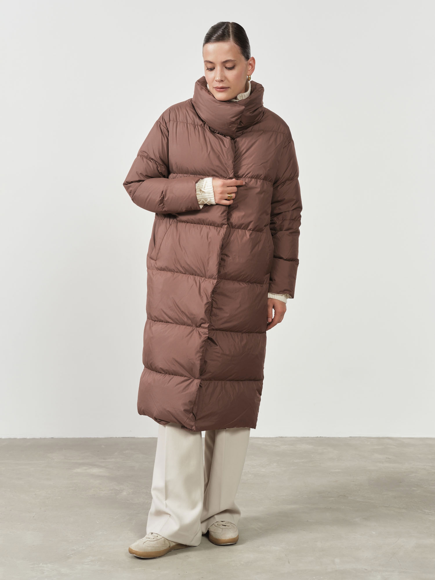 Объёмный высокий воротник-стойка защищает шею от ветра и холода, создаёт уют и добавляет модели современный характер.